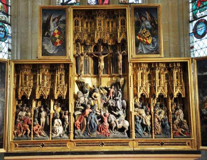 1476. Les scènes de la Passion sont sculptées en bois polychrome et les peintures sont attribuées à l'atelier du peintre bruxellois Roger Van der Weyden.